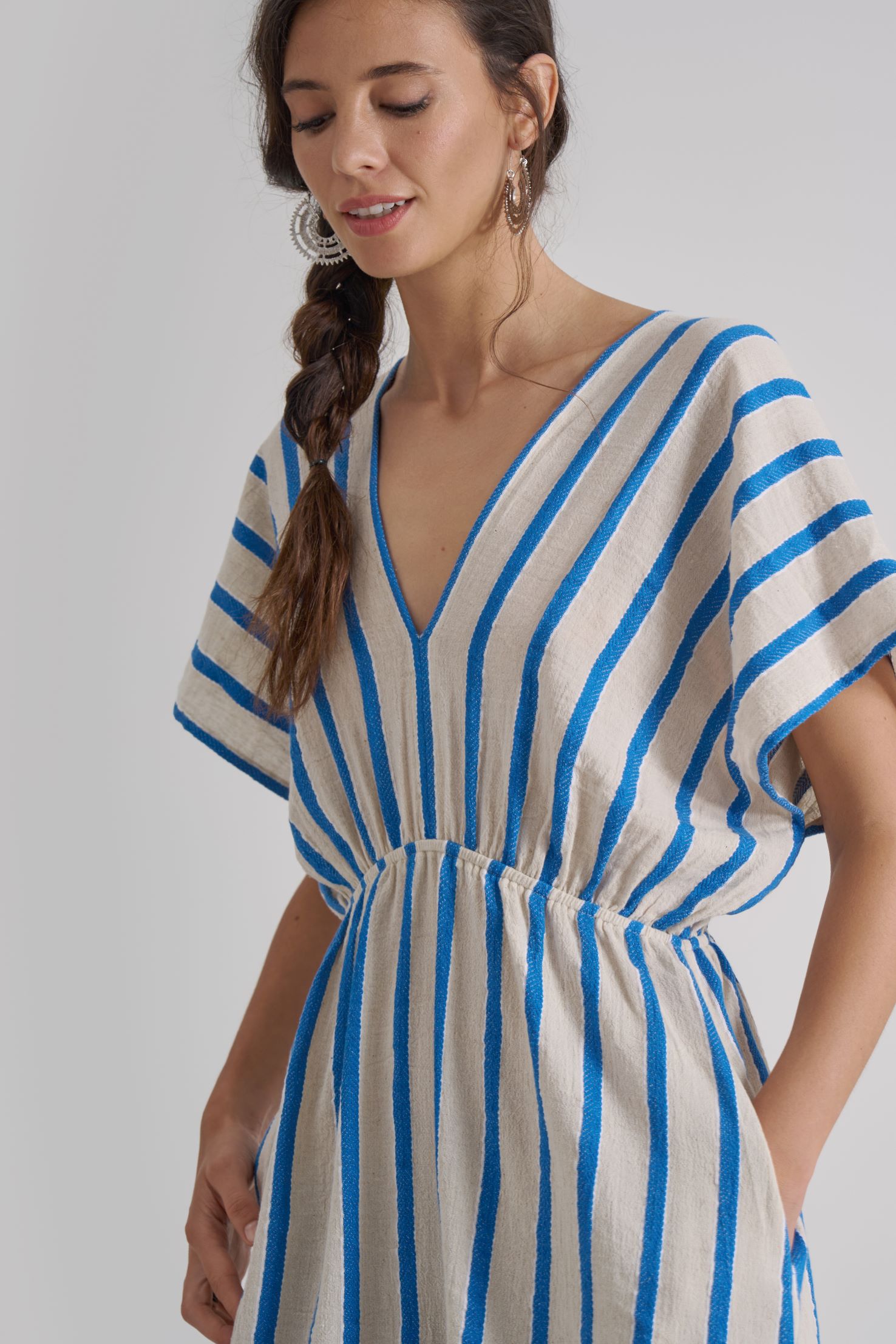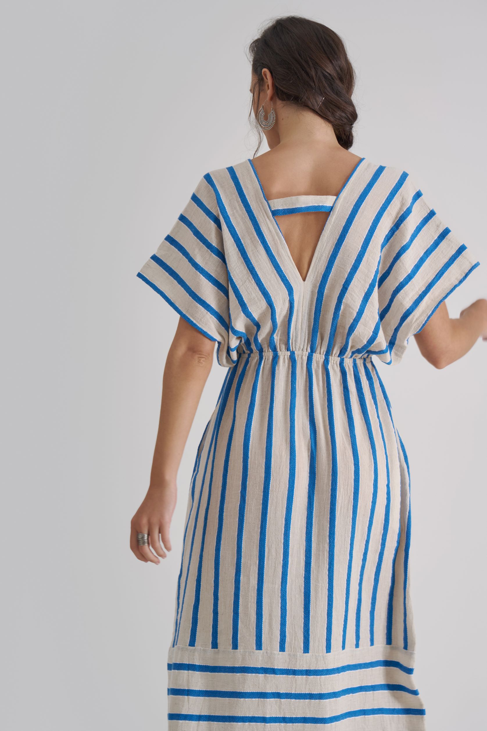 ATHENA transitions from a beach cover-up to a chic and casual outfit for beachside cafes.. Accessorize with wooden jewellery, an oversized hat and beachy tote bag to add elegance and functionality. Complete the ensemble with comfortable sandals or espadrilles and layered anklets for a bohemian touch.