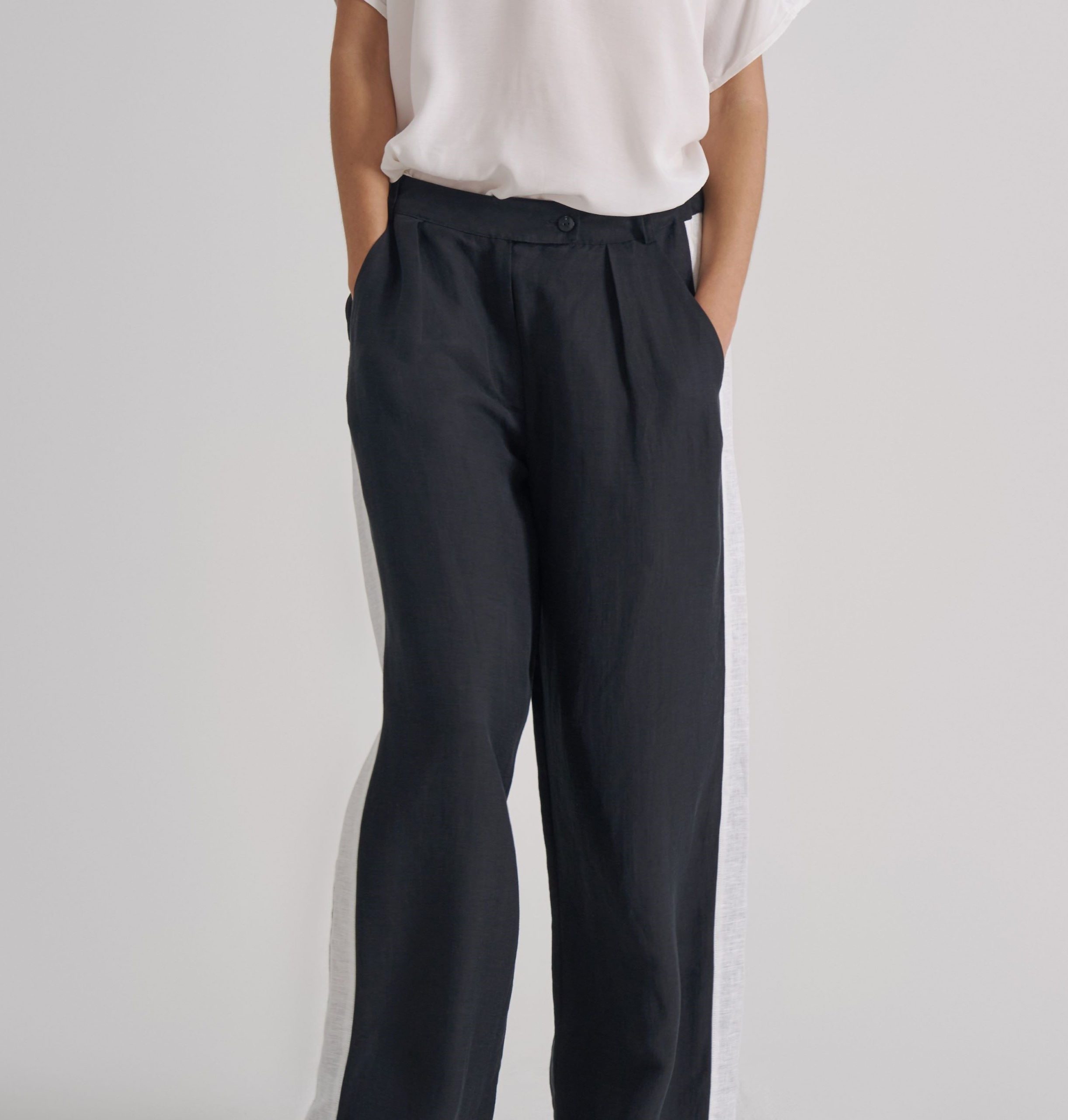 A menswear-inspired flat front trouser, with a relaxed fit, wide leg, tailored waist band, double darting and hidden adjustable elastics for added comfort and margin on sizing. Made from a lightweight linen cupro blend suiting, they are finished with side pockets and a fly-front zip.