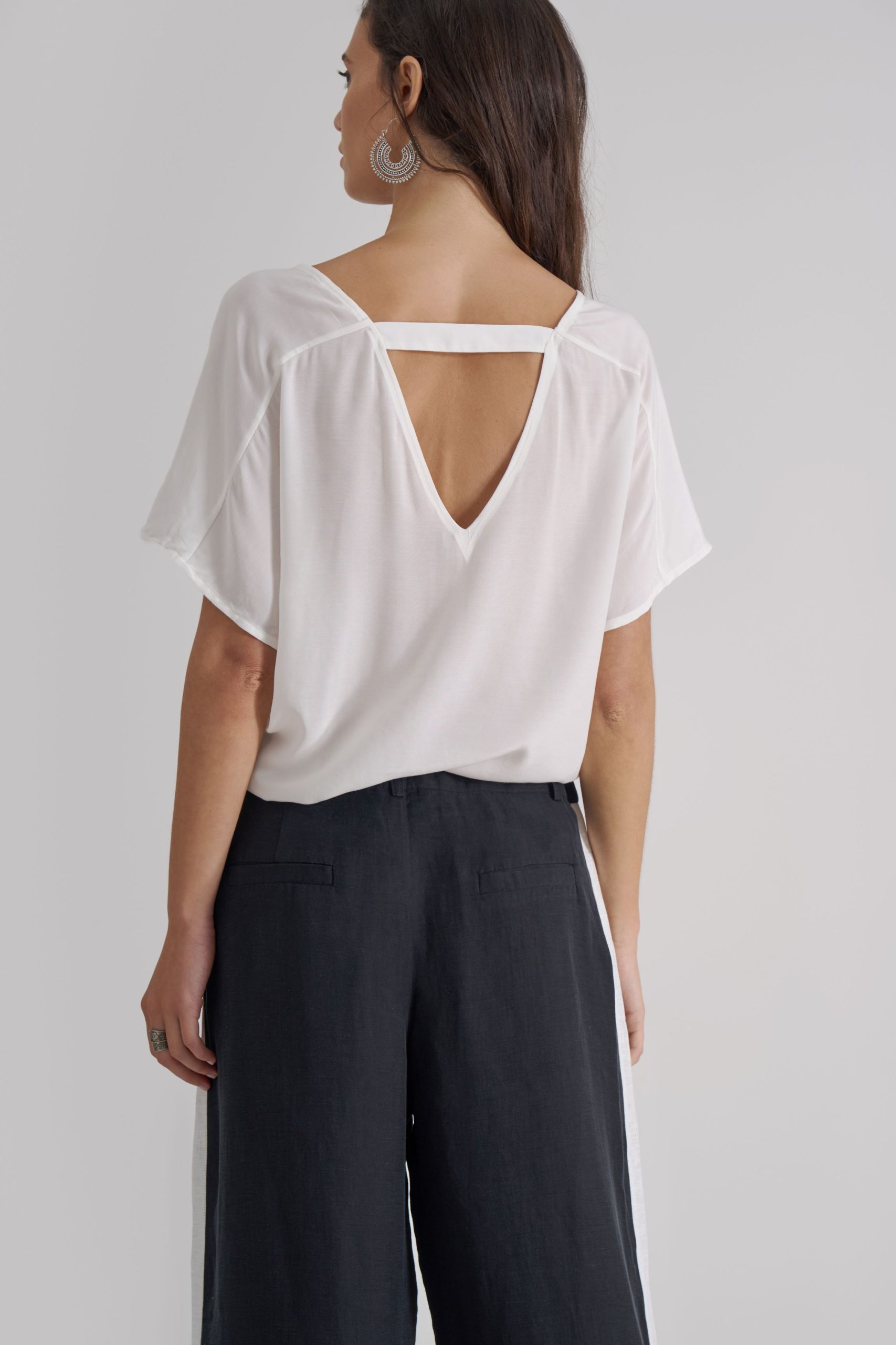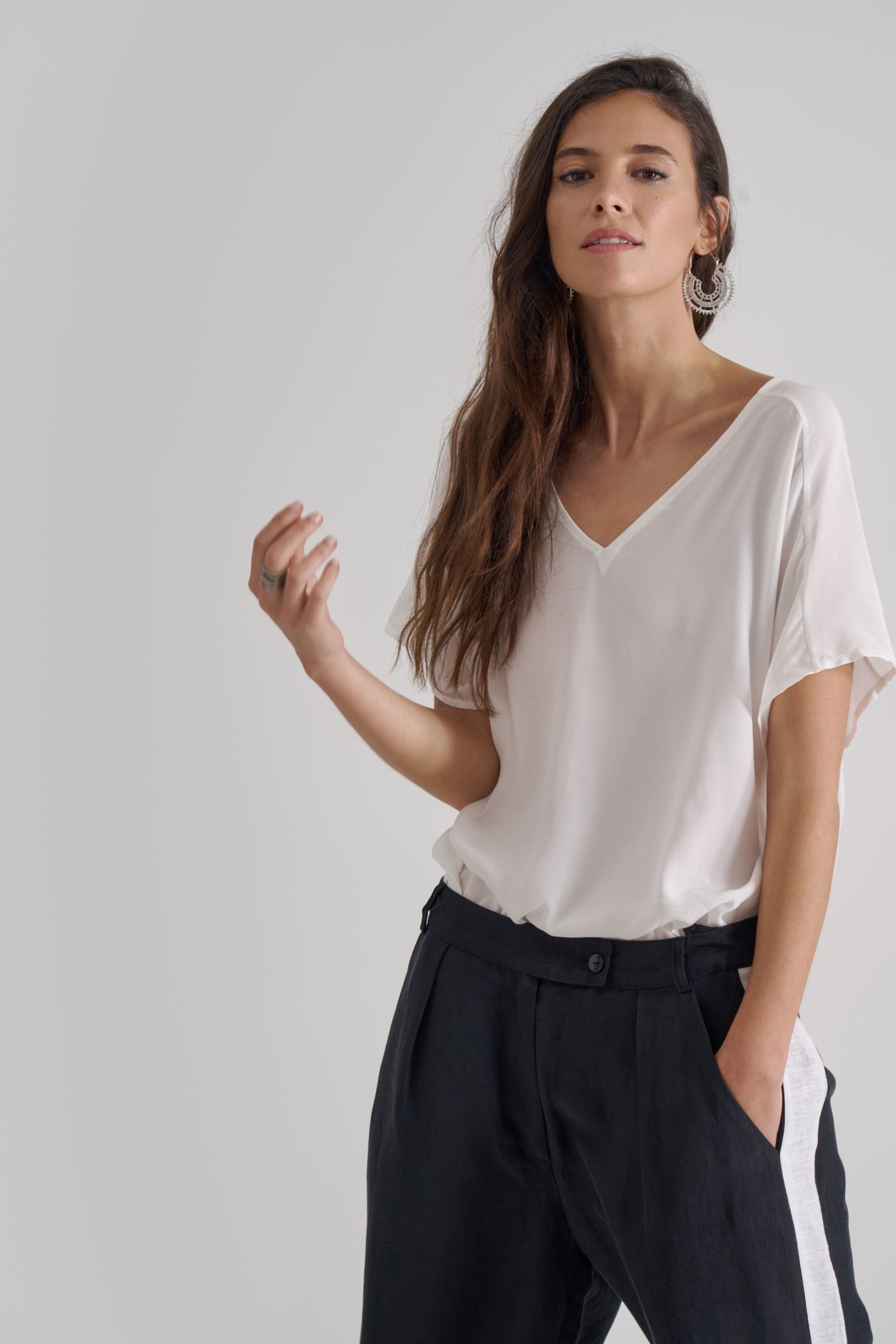 Pairs well with the AMEL matching blazer for a sophisticated look, or worn down with a cool graphic t-shirt or lightweight buttondown shirt with open collar and rolled up sleeves.