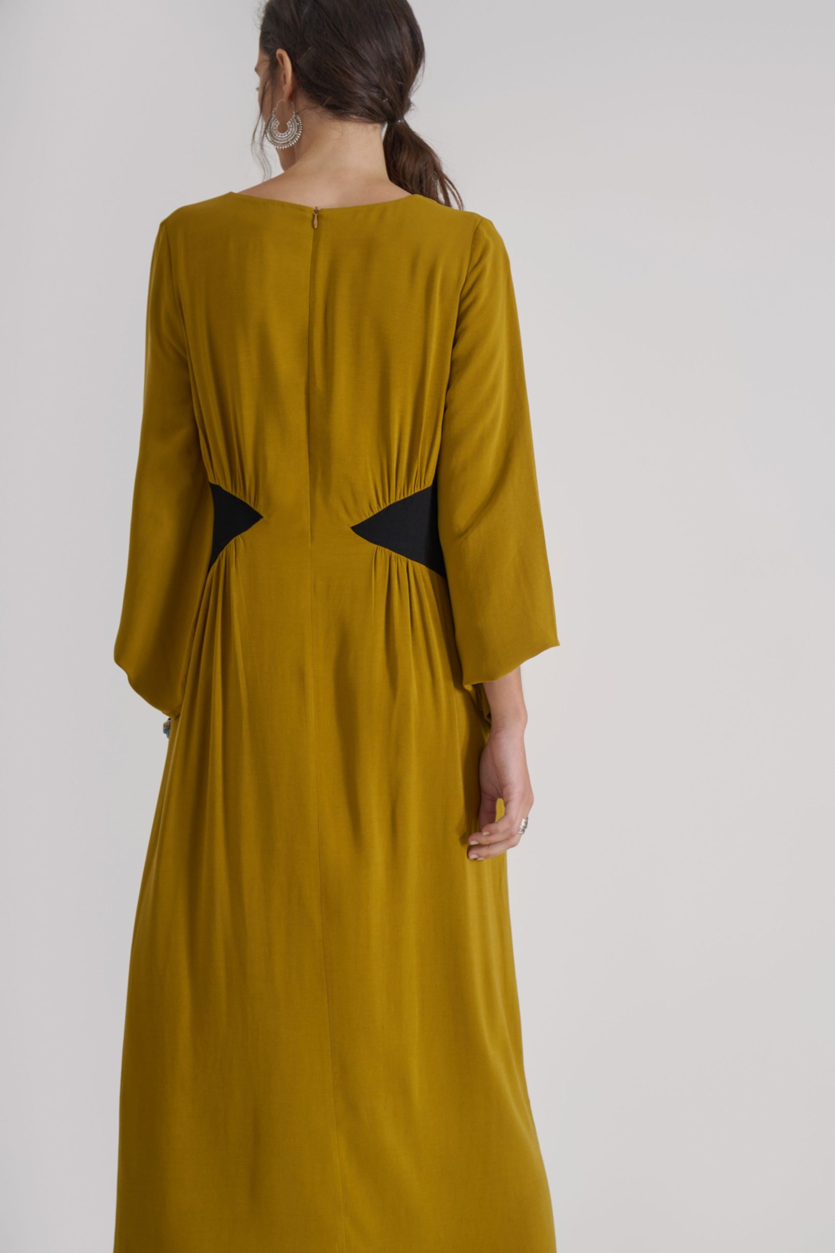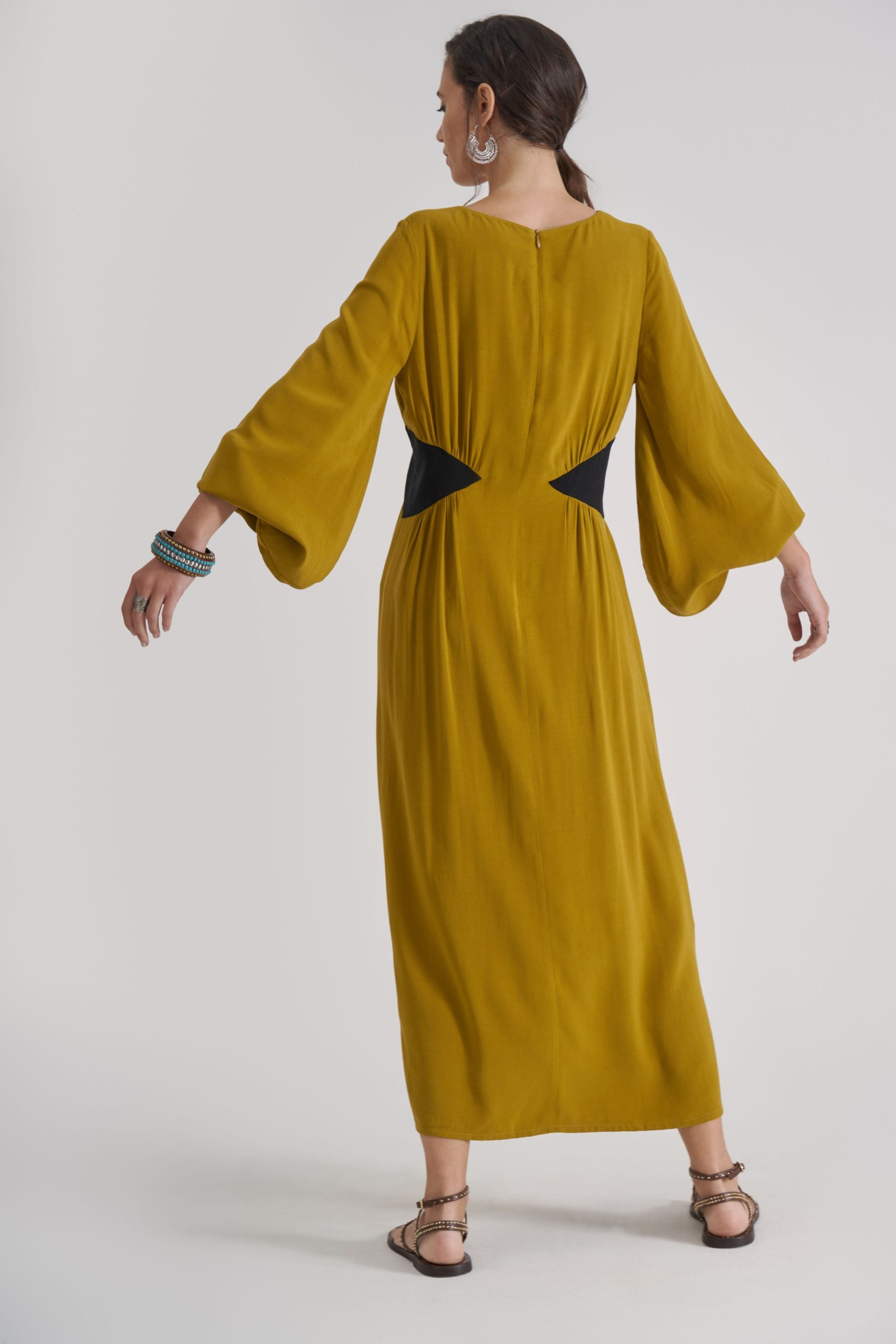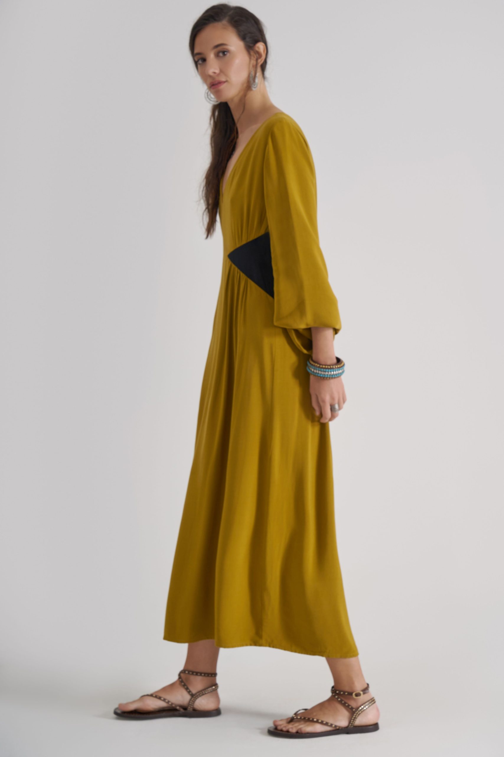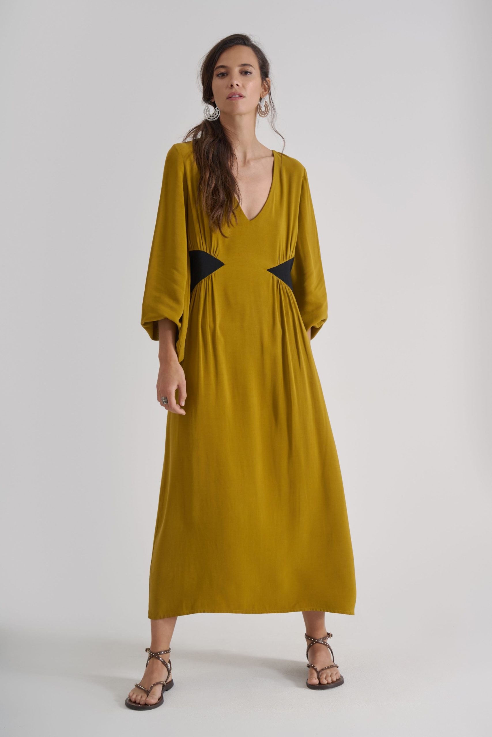 The TALIA dress is a stunning midi-length V-neck dress that exudes elegance and class. It features eye-catching triangle details at the upper hip in a contrasting color, adding a touch of visual interest. The oversized puff sleeves with elastic armholes and the high end look and feel of the fabric not only enhance the dress’s femininity but also make it a statement piece that stands out.